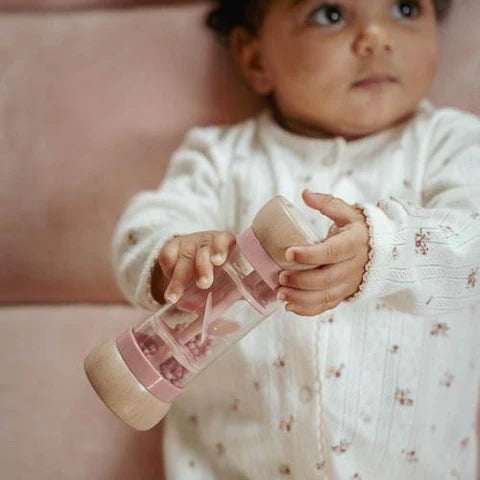Schud en rammel! Draai de regenrammelaar om en luister naar de rustgevende druppelgeluidjes van de balletjes die van de ene naar de andere kant van de regenmaker bewegen. Het stimuleert de zintuiglijke ontwikkeling en het muzikale talent van je baby. De balletjes, vallen door kleine openingen in de buis en laten de propeller draaien, wat resulteert in een aangenaam geluid. De regenrammelaar is ontworpen voor kleine handjes en ligt lekker in de hand. De houten boven- en onderkant zijn versierd met een illustratie van een bloem en een vlinder en uit de Fairy Garden-collectie.