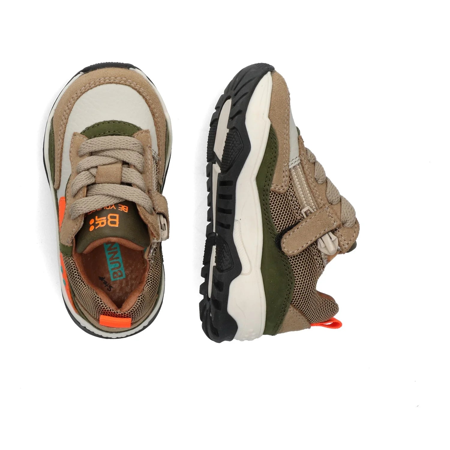 De lage kindersneakers zijn oranje en hebben verschillende kleuraccenten. De trendy sneakers zijn gemaakt van een mix van leer, suède en mesh. Met de rits- en veters bevestig je de schoentjes stevig aan de voetjes van je kindje. De chunky zool is hartstikke trendy en deze modieuze sneaker is dan ook een echte must-have voor de garderobe van je (b)engel!